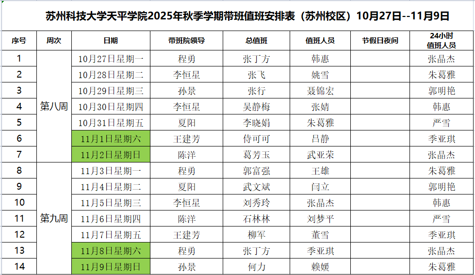 苏州科技大学天平学院2025年秋季学期带班值班安排表(苏州校区)10月27日--11月9日