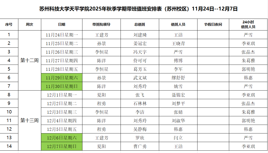苏州科技大学天平学院2025年秋季学期带班值班安排表(11月24日--12月7日)