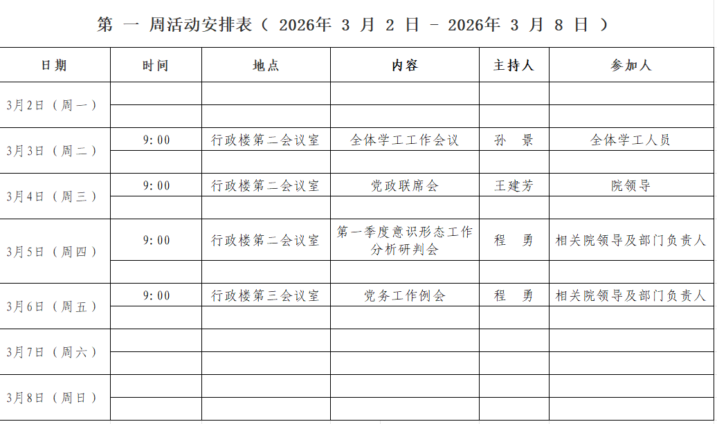 第一周活动安排表( 2026年 3 月 2 日 - 2026年 3 月 8 日 )