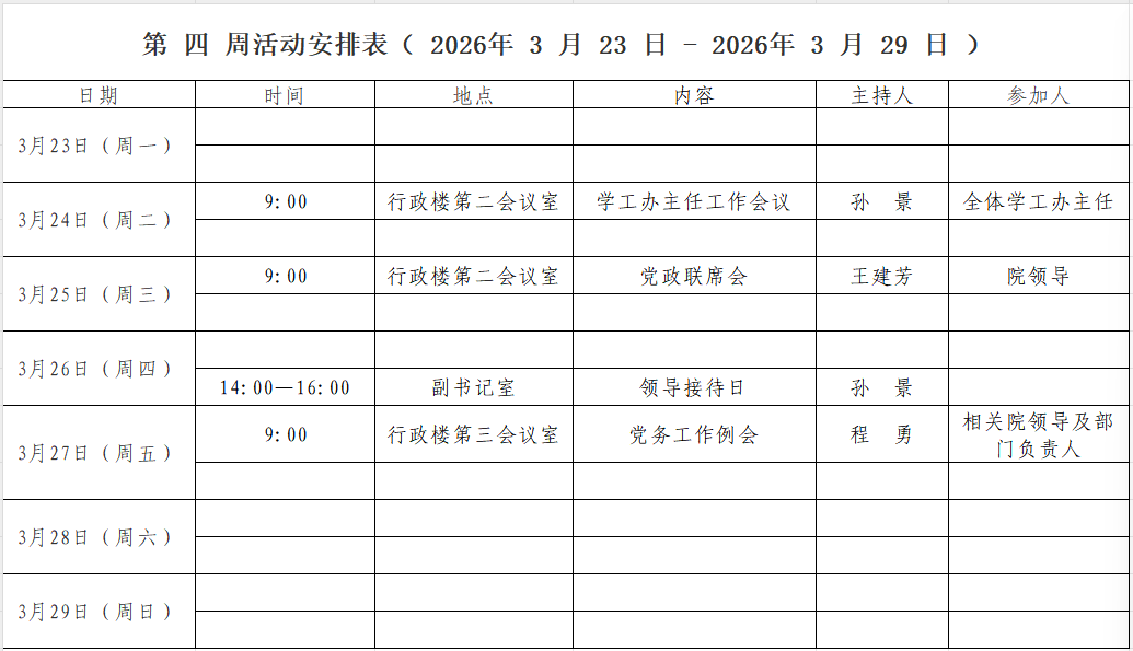 第 四 周活动安排表( 2026年 3 月 23 日 - 2026年 3 月 29 日 )