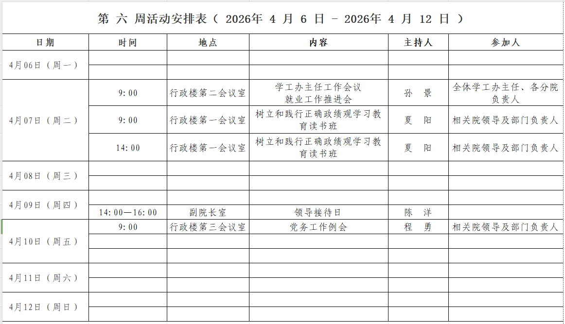 第 六 周活动安排表( 2026年 4 月 7 日 - 2026年 4 月 12 日 )
