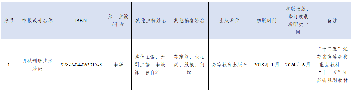 根据《省教育厅关于做好普通高等教育本科国家级规划教材推荐申报工作的通知》(苏教高函〔2026〕1号)要求,我院组织开展了申报推荐工作。经个人申报、所在单位推荐、学院党政联席会审定,拟推荐《机械制造技术基础》为普通高等教育本科国家级规划教材,现对拟推荐教材的相关信息进行公示。