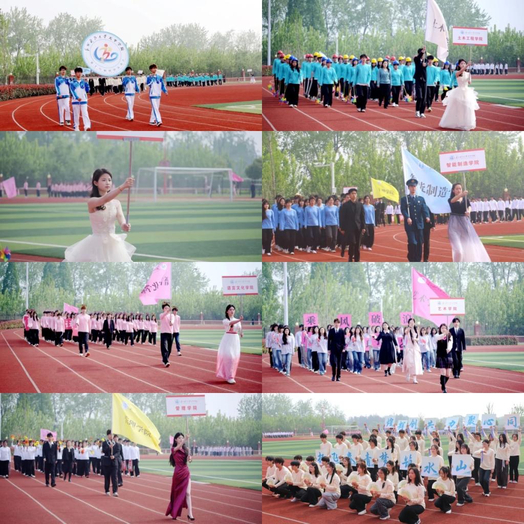 在铿锵激昂的《运动会进行曲》中,运动会会徽队、各学院方队举着院旗,迈着整齐的步伐,昂首挺胸地走入会场。各学院方队在展示学院风采时,巧妙地融入了本学院的专业特色,用创意与活力点燃了赛场激情,充分展示了学院学子昂扬的精神风貌。