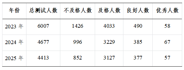 近三年学院体测工作取得阶段性基础成效:测试总人数呈小幅下降趋势,不及格人数从 2023 年 1426 人降至 2025 年 852 人,三年不及格率依次为 23.74%、21.30%、19.31%,呈持续下降态势;及格人数保持相对稳定,及格及以上比例逐年提升,体现学院基础体质保障工作的有效性。