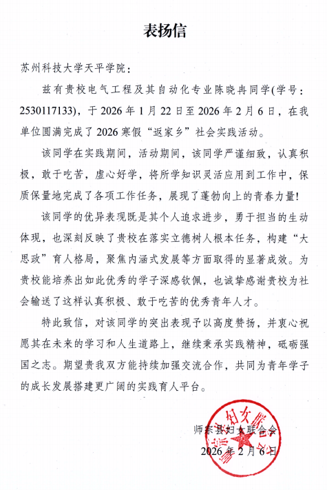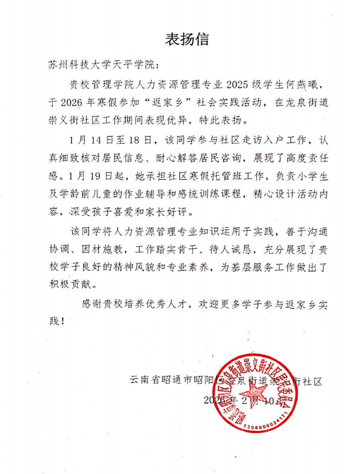 近日,2026年寒假大学生社会实践活动圆满落幕。我院学子积极响应号召,深入家乡基层,围绕“逐梦强国建设,青春挺膺担当”主题,广泛开展志愿服务、岗位实习、文化传承等形式多样的实践活动。他们以扎实的行动服务社会、锻炼自我,展现了新时代大学生的责任担当与精神风貌。活动中,多名同学表现突出,获得家乡相关部门或组织的书面表扬与表彰,为学院赢得了良好的社会声誉。