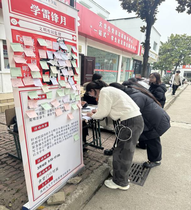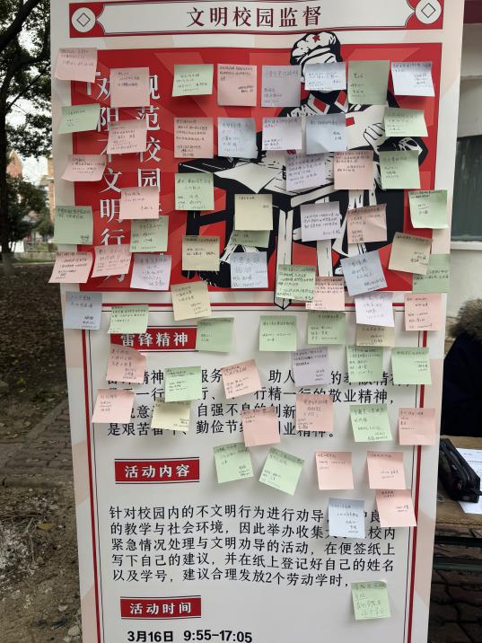 活动结束后,志愿者们对收集到的建议进行分类整理。大家纷纷表示,此次活动不仅让更多同学关注到校园文明问题,也在实践中传承了雷锋精神,提升了自身的社会责任感与服务意识,更深刻体会到共建美好校园的意义。
