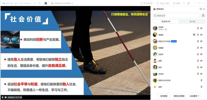 答辩会上,各项目团队通过共享屏幕,就项目背景、研究进展、初步成果及未来规划进行了详细汇报。其中,《“双碳”目标下供应链数字化对企业ESG绩效的影响研究》项目聚焦国家战略,深入探讨了供应链数字化如何通过技术赋能与流程优化,提升企业的环境、社会和治理综合表现;《云瞳视辅眼镜》项目则致力于科技助残,通过融合AI视觉与多传感器技术,为视障人群开发具备避障导航与语音交互功能的智能辅助设备,彰显了科技向善的社会价值;《宠梦天堂》项目从人文关怀出发,规划了专业、贴心的宠物善终服务,体现了对生命尊严的尊重与情感记忆的珍视。